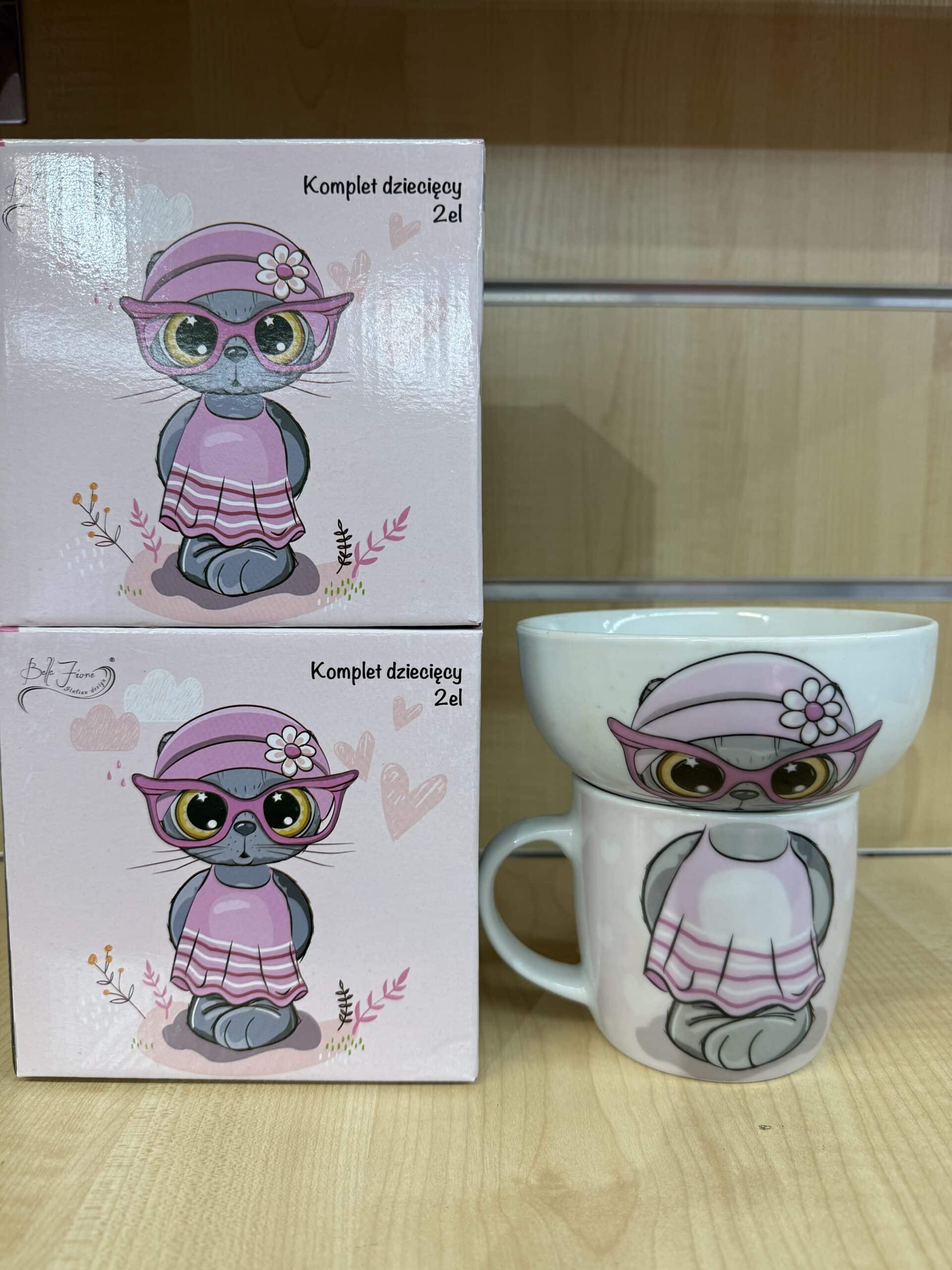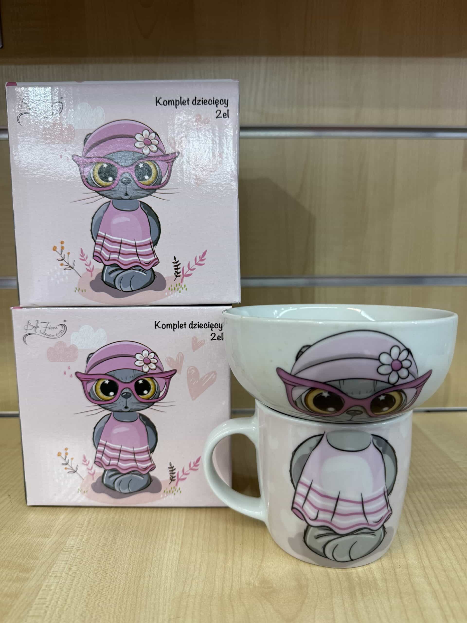 Uroczy dziecięcy komplet porcelanowy składający się z kubka i miseczki z motywem kotka w różowej sukience i okularach. Idealny na prezent dla małej miłośniczki zwierząt!