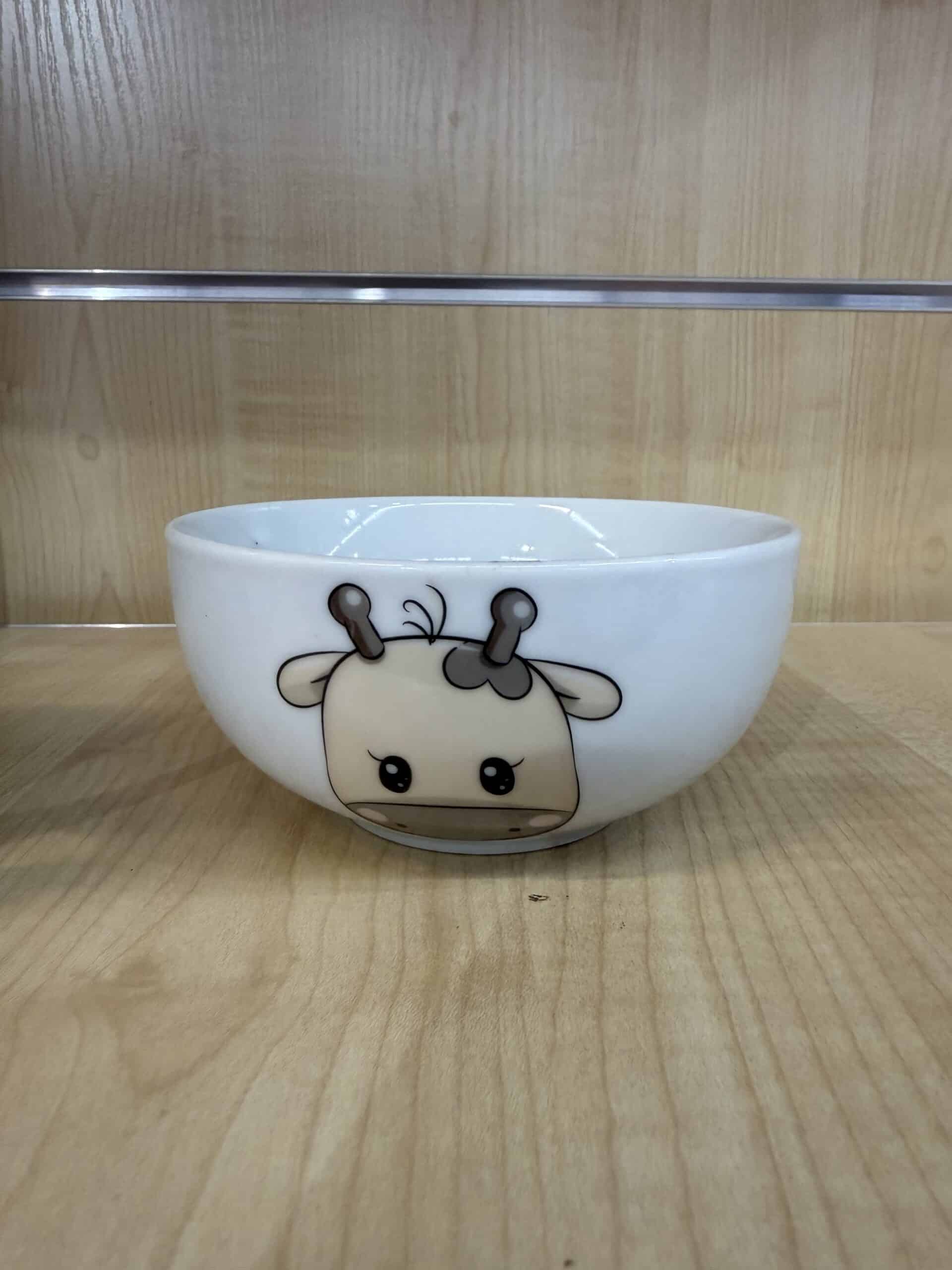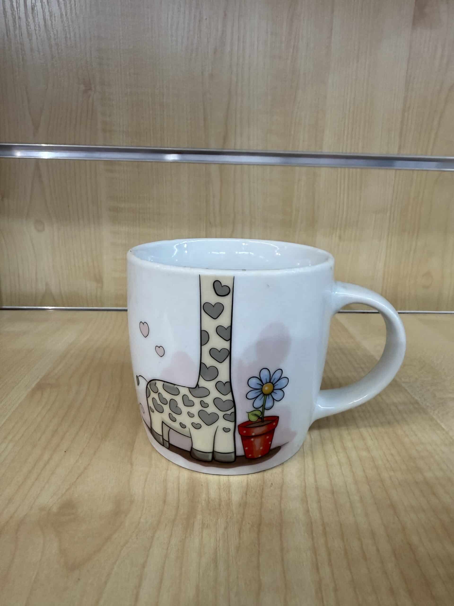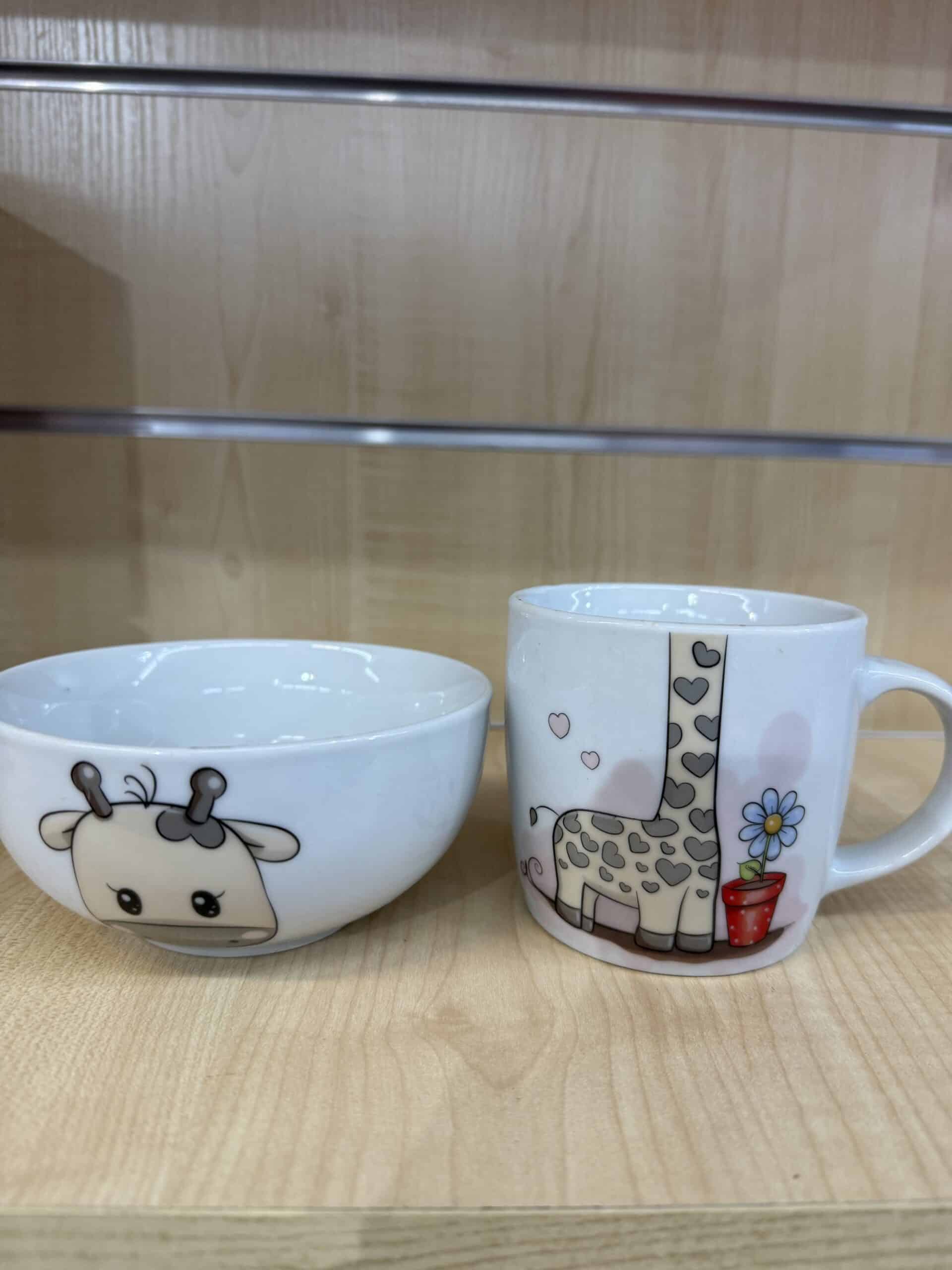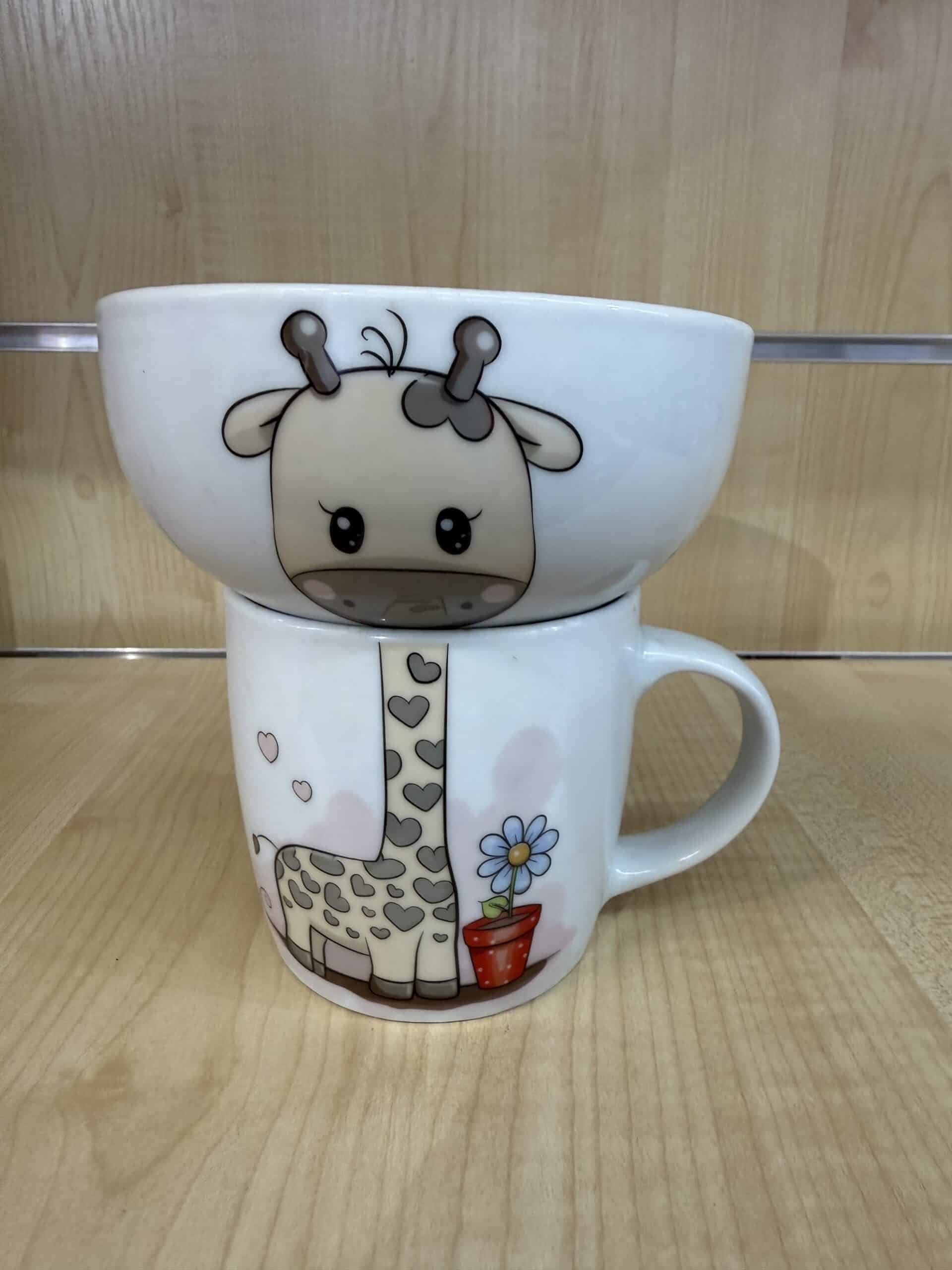 Dwuczęściowy komplet składający się z kubka (300 ml) i miseczki (500 ml), ozdobiony słodkim motywem sympatycznej żyrafki w błękitnej sukience i kwiatuszkach. ?