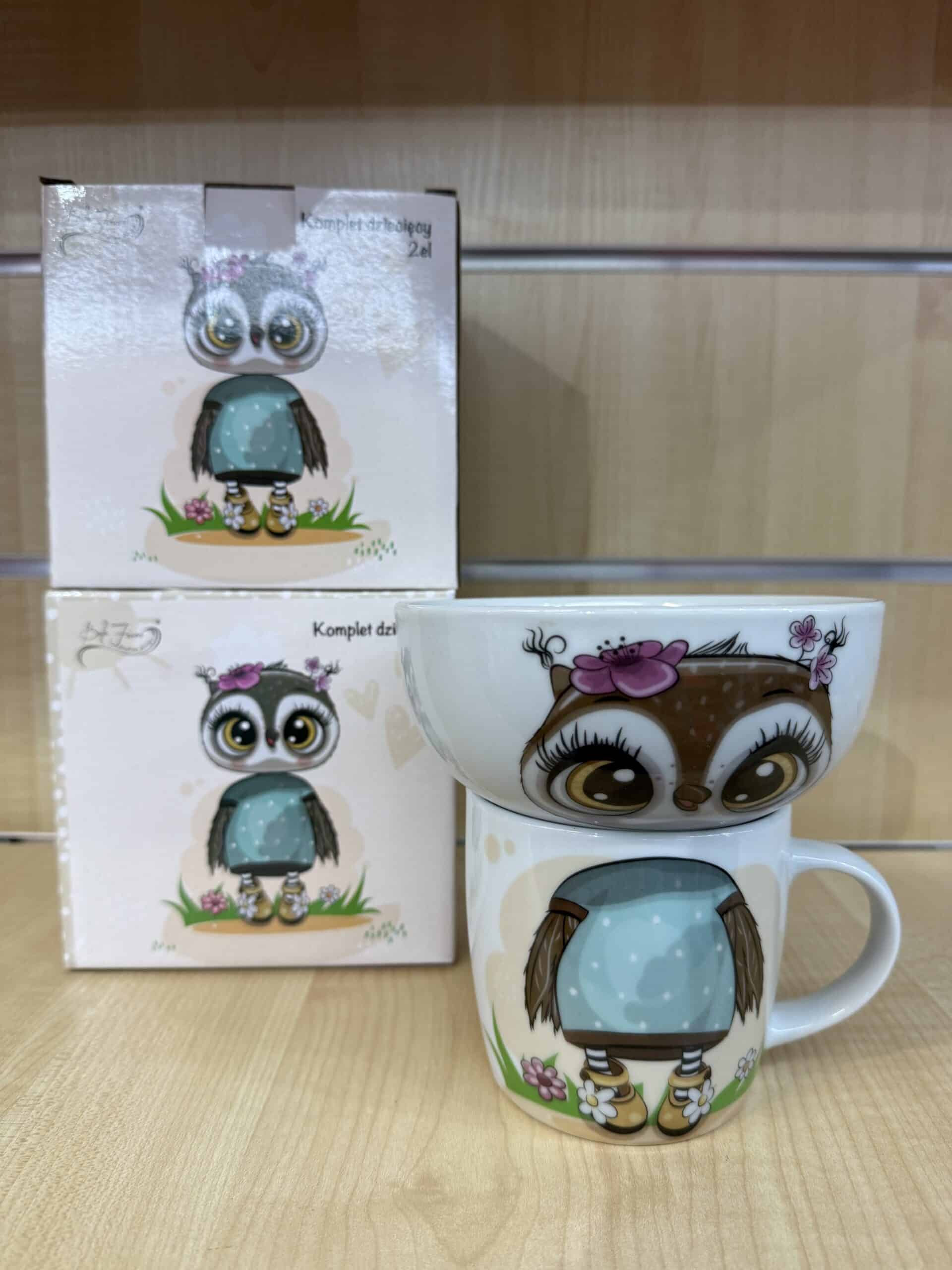 Zestaw porcelanowy składający się z dwóch elementów – kubka o pojemności 300 ml i miseczki 500 ml. Uroczy wzór z sympatyczną sówką w błękitnej sukience i kwiatuszkach sprawia, że każdy posiłek staje się przyjemnością. ?