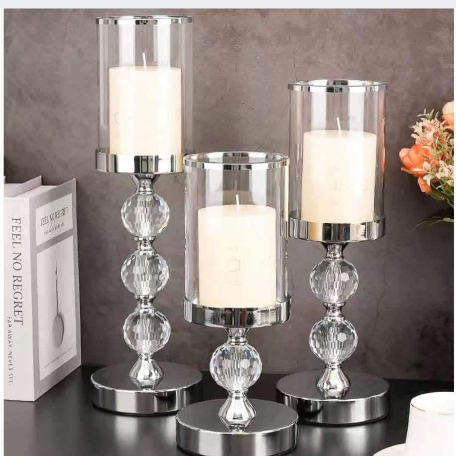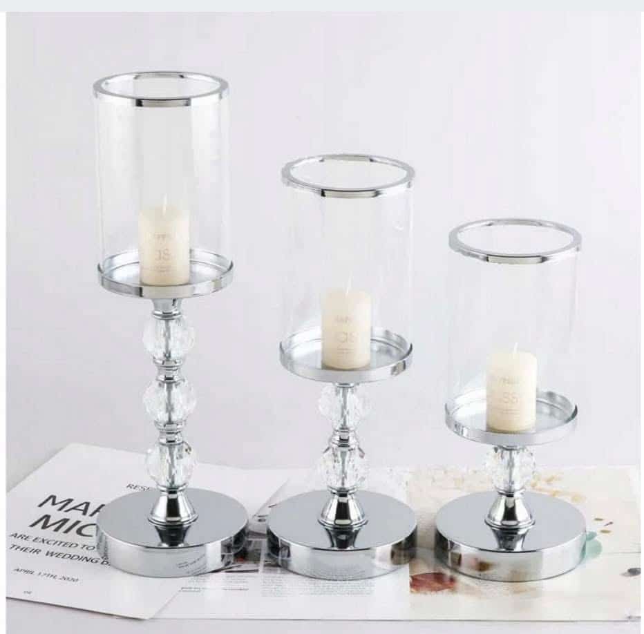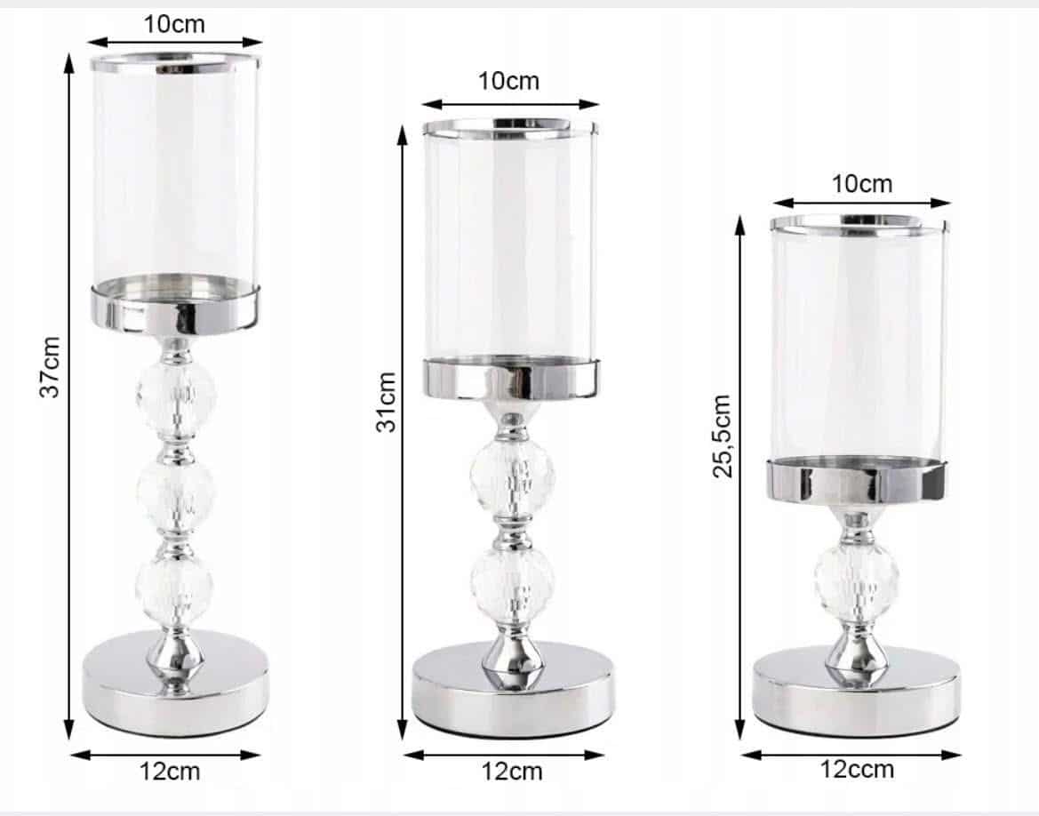 Zestaw trzech eleganckich świeczników w nowoczesnym stylu glamour. Połączenie przezroczystego szkła z połyskującym, srebrnym metalem nadaje im wyjątkowej klasy i szyku. Idealne do wnętrz klasycznych i nowoczesnych, sprawdzą się jako dekoracja stołu, komody czy salonu. Doskonałe na świece typu tealight i klasyczne – stworzą nastrojowy klimat podczas spotkań i uroczystości.