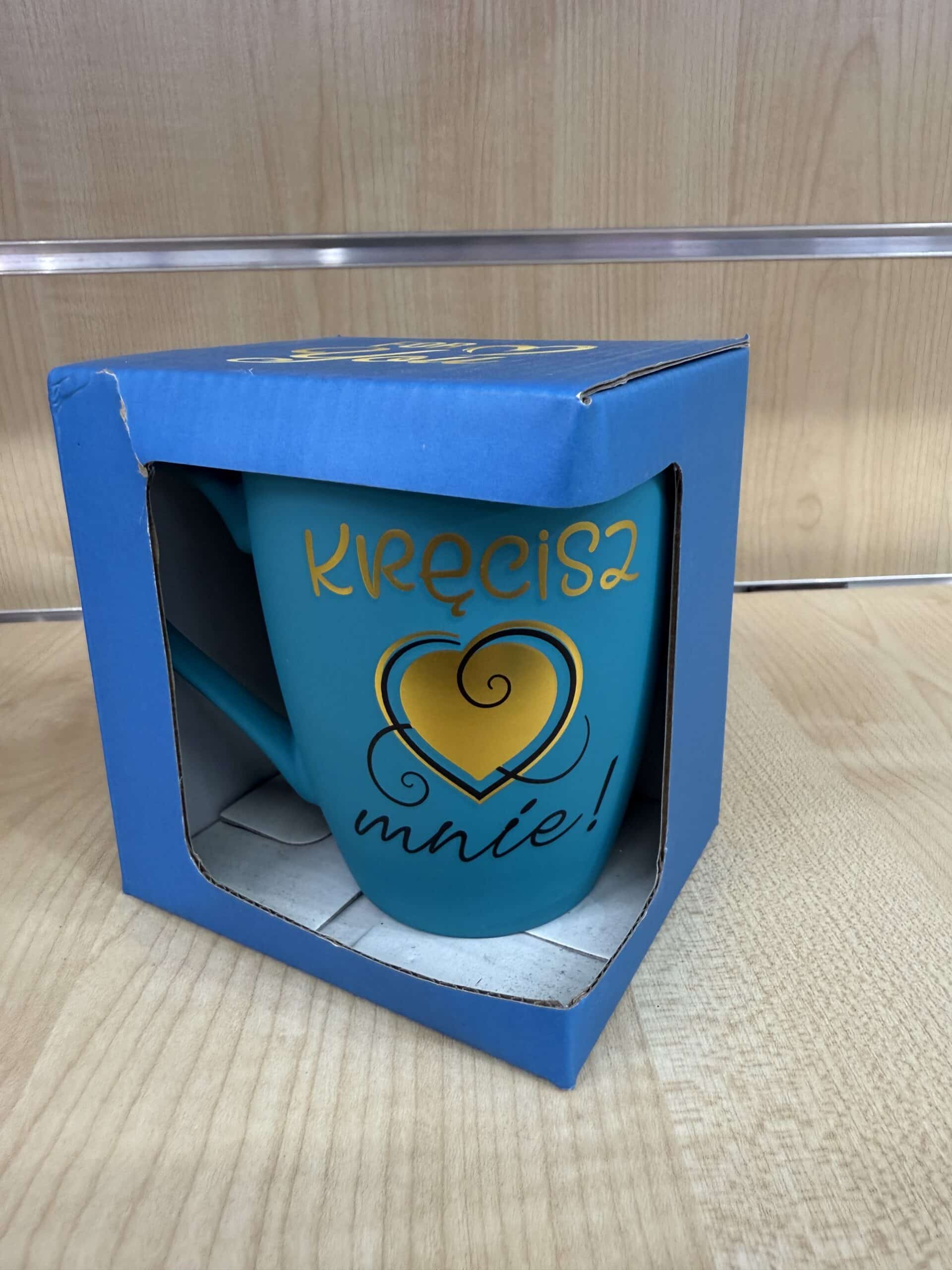 Wyjątkowy turkusowy kubek z napisem “Kręcisz mnie!” oraz graficznym motywem złotego serca, który przyciąga wzrok i dodaje energii. Zapakowany w estetyczne niebieskie pudełko. Idealny pomysł na prezent dla osoby, która rozświetla Twój dzień i kręci Twoim światem!
