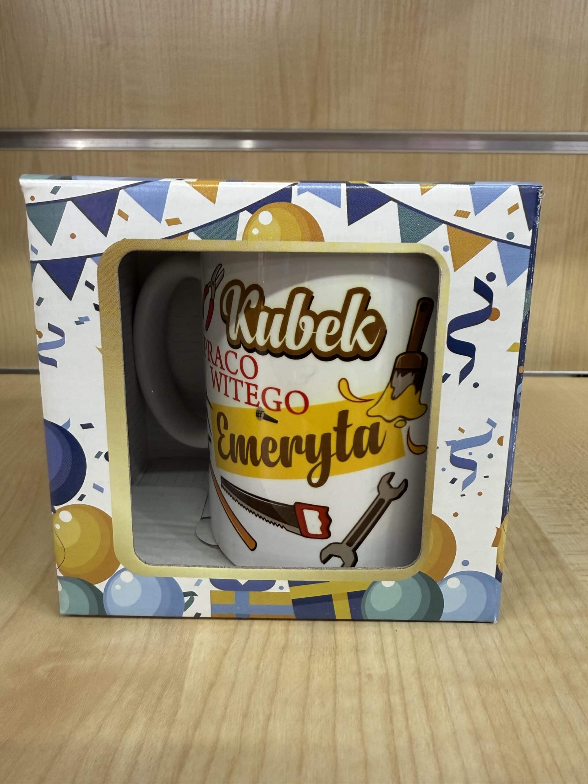 Zabawny ceramiczny kubek z motywem narzędzi i napisem “Kubek Pracowitego Emeryta”. Idealny dla osoby, która mimo przejścia na emeryturę nie potrafi usiedzieć w miejscu i zawsze znajdzie coś do zrobienia. Kolorowe pudełko z balonami i girlandami dodaje prezentowi wyjątkowego charakteru, sprawiając, że świetnie nadaje się jako upominek na nowy etap życia.