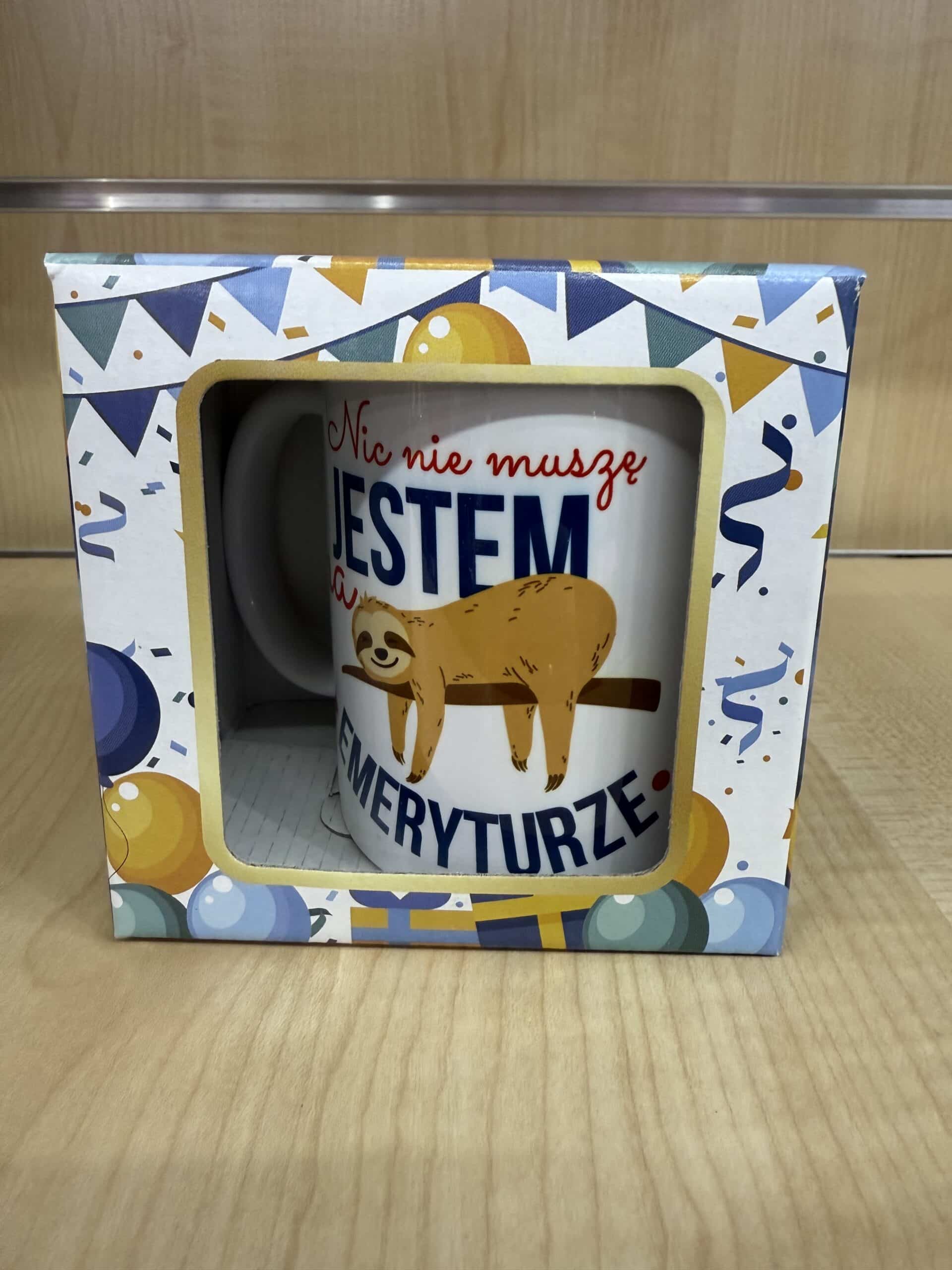 Ceramiczny kubek z wesołym motywem leniwca oraz napisem “Nic nie muszę, jestem na emeryturze”. Idealny prezent dla osoby, która rozpoczyna swój czas relaksu i wolności od obowiązków zawodowych. Zapakowany w kolorowe pudełko z motywem balonów i girland, które dodają całości uroku i sprawiają, że jest to świetny upominek na specjalną okazję.