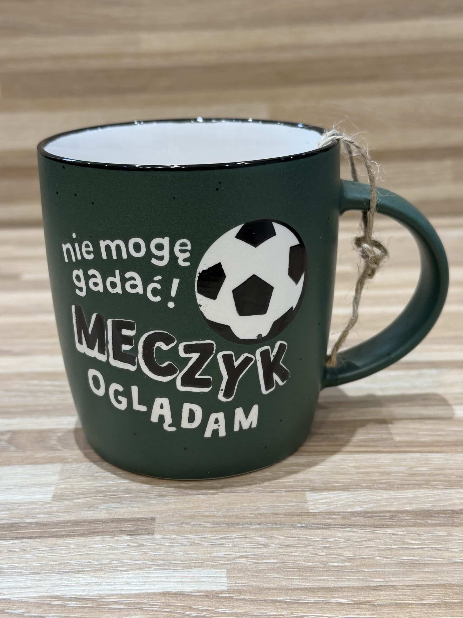 Stylowy ciemnozielony kubek z nadrukiem piłki i napisem “Nie mogę gadać! Mecz oglądam”. Idealny prezent dla fanów piłki nożnej i sportowych emocji.
