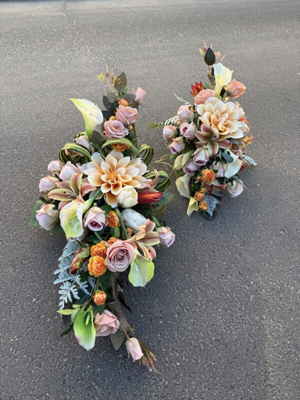 Zestaw dwóch dekoracji nagrobnych w harmonijnych, stonowanych kolorach – idealny na grób bliskiej osoby. Kompozycje łączą w sobie delikatność różu, ciepłe odcienie ecru i akcenty głębokiego pomarańczu. Główną rolę odgrywa okazała dalia w odcieniu morelowo-pomarańczowym, która przyciąga wzrok i nadaje całości wyjątkowego charakteru.