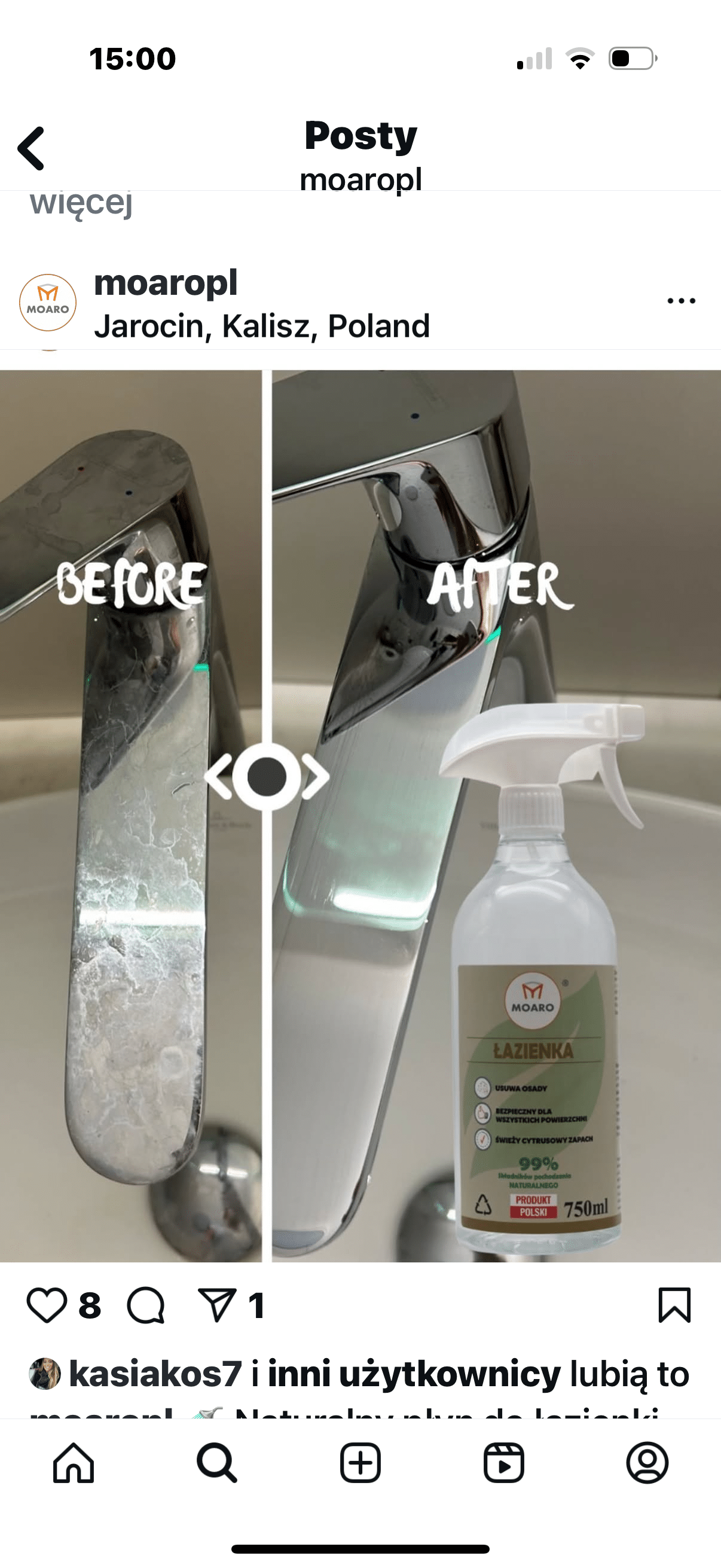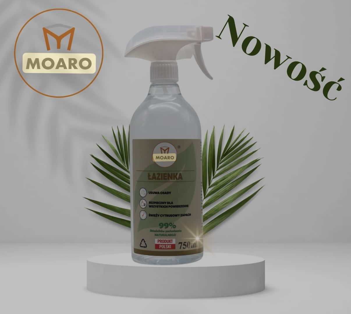MOARO Łazienka 750 ml – skuteczny płyn do czyszczenia łazienek, który w mgnieniu oka usuwa osady z wody, mydła i kamienia. Bezpieczny dla wszystkich powierzchni, pozostawia świeży, cytrusowy zapach. Zawiera 99% składników pochodzenia naturalnego. Polski produkt stworzony, by sprzątanie było szybkie, łatwe i przyjemne.