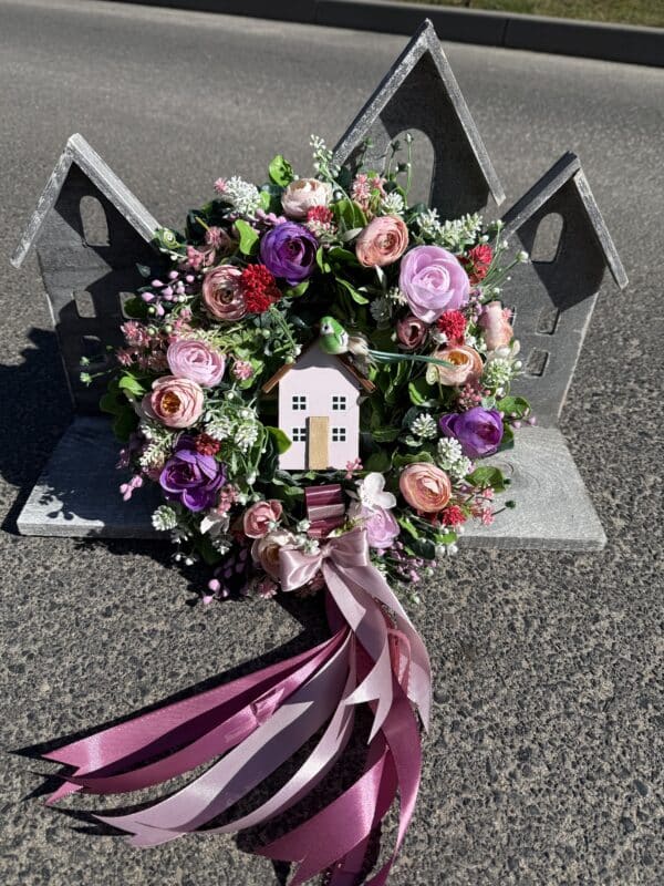 Subtelny, romantyczny wianek, który wniesie do Twojego domu nutę wiosennej elegancji. Wykonany na bazie o średnicy 20 cm, a wraz z dekoracją osiąga około 35 cm. Wypełniony pastelowymi kwiatami w odcieniach różu, fioletu i zieleni, przeplatany drobnymi dodatkami, które nadają mu lekkości i naturalnego uroku. Uroczy, malutki domek w centralnej części oraz delikatna kokarda z długą wstążką dodają mu wyjątkowego charakteru. Idealny do zawieszenia na drzwiach, ścianie lub jako dekoracja wnętrza.
