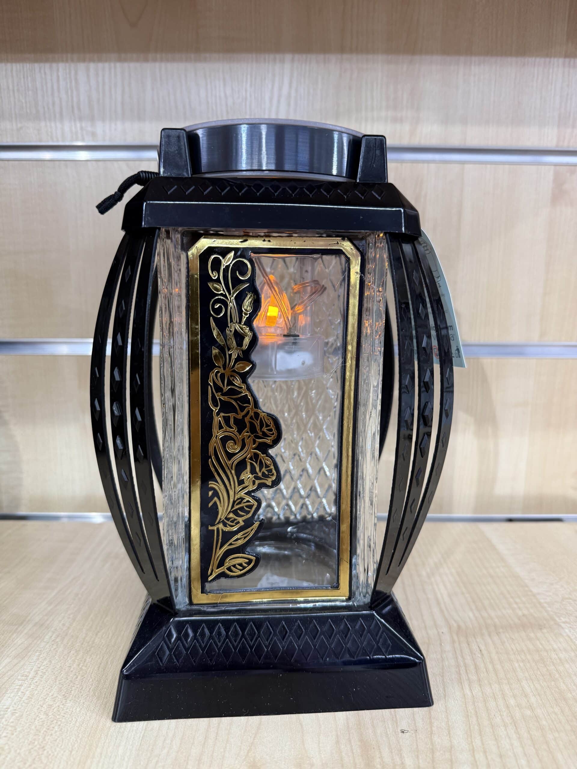 Znicz solarny o wysokości 25 cm, utrzymany w eleganckiej czerni z pięknymi złotymi zdobieniami w formie kwiatowego motywu. Dzięki zasilaniu energią słoneczną świeci ciepłym światłem, bez konieczności wymiany wkładów. Trwały i estetyczny, doskonale podkreśli pamięć o bliskich, będąc jednocześnie elegancką ozdobą nagrobka.