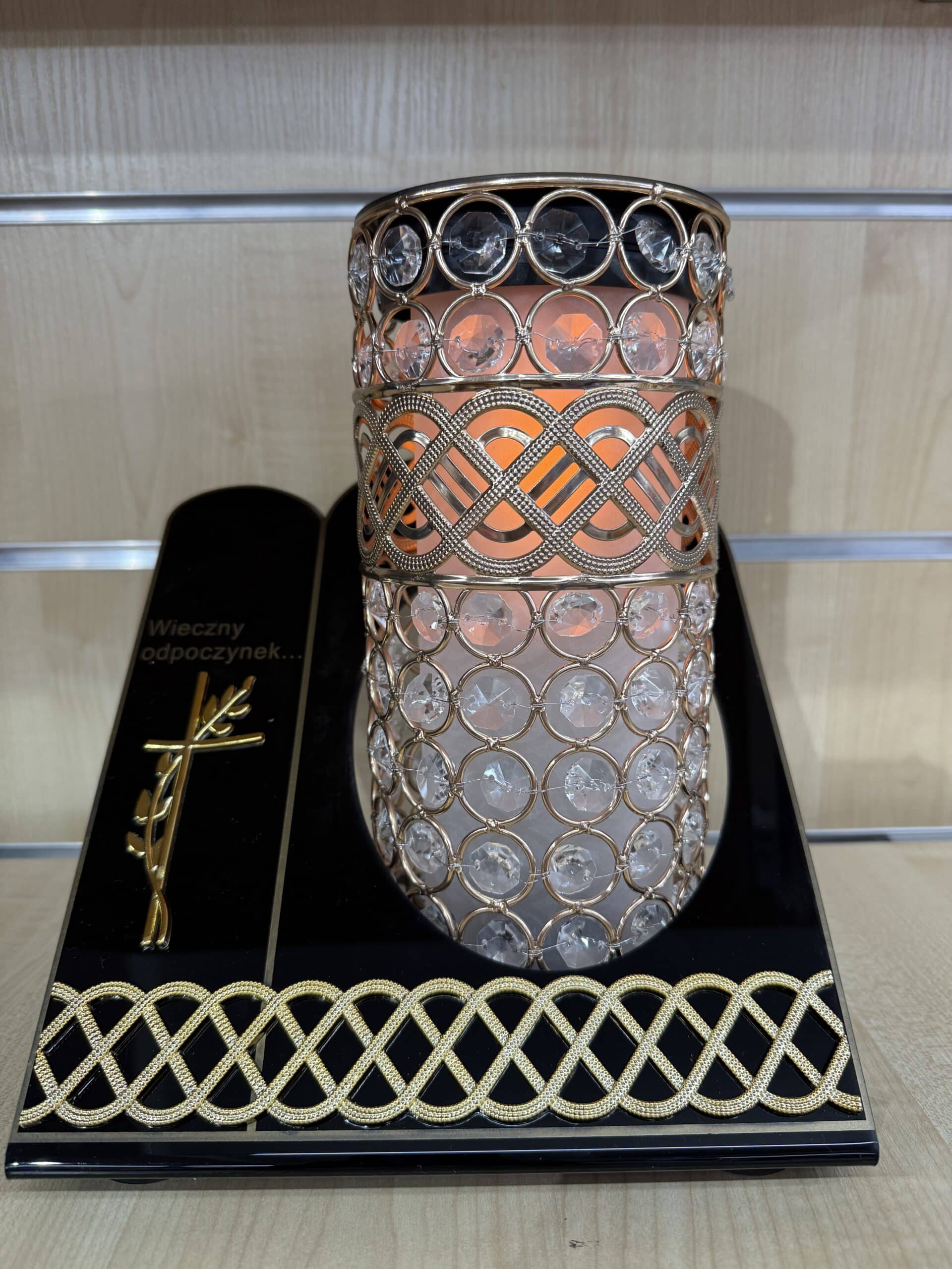 Znicz solarny o wysokości 25 cm i szerokości 22 cm, elegancko zdobiony złotymi detalami. Ładowany energią słoneczną, nie wymaga wymiany wkładów, dzięki czemu jest praktyczny i trwały. Stylowe wykończenie oraz ciepłe światło sprawiają, że pięknie podkreśla pamięć o bliskich, stanowiąc wyjątkową ozdobę nagrobka.